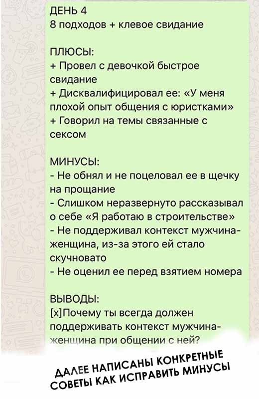 Полезность информации;Информация дается порциями. Что узнал – то сразу внедрил и отработал. За счет этого ты все запоминаешь и применяешь, нет лишней информации и воды. Мы не видим смысла сразу рассказывать как проводить свидания, если человек даже не умеет знакомиться. Информация должна быть к месту.;Ты получаешь огромный поток информации сразу, а отрабатываешь только 20%. Запомнить ты сможешь только ту информацию, которую ты пропустил через свой опыт и отработал. 80% информации тебе, скорее всего, не пригодится, так как на практике ты ее не отработаешь. Это как в школе у тебя 10 предметов, но чтобы потом вспомнить химию, тебе нужно открывать учебник и заново изучать.;Информацию ты выбираешь сам. Даже если она и полезна тебе, то не факт, что ты ее применишь, ведь ты столкнешься со страхами, ленью, отсутствием мотивации. Велика вероятность попасть в ловушку «я сначала все изучу, а потом буду практиковаться»: нет, даже если ты прочитаешь 100 книг, то в момент знакомства все твои знания улетучаться. Проверь сам, если не веришь мне.